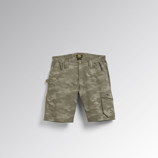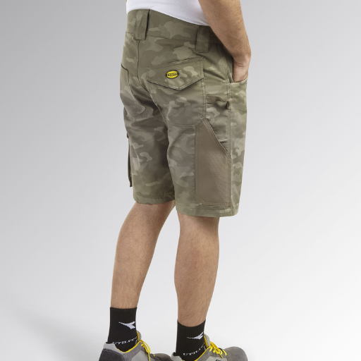 Bermuda con stampa camouflage con tasca laterale, dettagli rifrangenti, tasca portametro e portamartello in canvas poliestere antiabrasione, elastico in vita, tripla cucitura. Cintura sagomata per un maggior comfort.