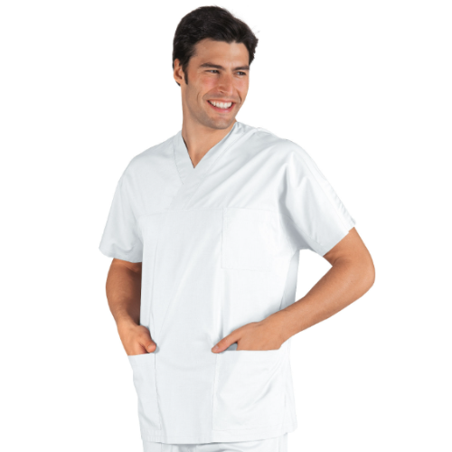 Casacca a collo a V unisex a mezza manica bianco. Per settore medicale, estetico, sanitario e ospedaliero. Ideale come divisa da lavoro per medico ed infermiere uomo e donna. Con 2 tasche e taschino al petto.