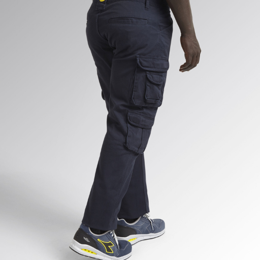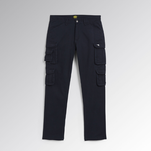 Pantalone cargo tasconato elasticizzato, lavaggio ad enzimi, 4 tasche laterali portaoggetti, tripla cucitura.