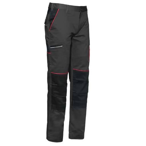 Pantalone da lavoro in tessuto misto elasticizzato dotato di due tasche frontali, un tascone su gamba sinistra, una tasca porta telefono frontale a scomparsa, due tasche posteriori ed una tasca porta metro. Altre caratteristiche del capo sono l’elastico in vita che assieme al tessuto elasticizzato esaltano il comfort del pantalone mentre il rinforzo posteriore e le porta ginocchiere ne aumentano la resistenza. Tre piping riflettenti offrono una visibilità nei casi di scarsa visibilità (dove non sia richiesto un prodotto certificato EN20471). Confezionato in box.