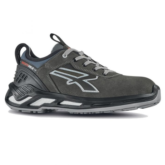 Scarpe antinfortunistiche basse, leggere e comode U-Power della linea Red 360, con tomaia in pelle nabuk naturale bottalato, idrorepellente, collarino con tessuto in fibra Lycra® e tallonetta anti-shock, puntale in alluminio, antiperforazione, antiscivolo e suola PU/PU infinergy, S3 SRC CI ESD.